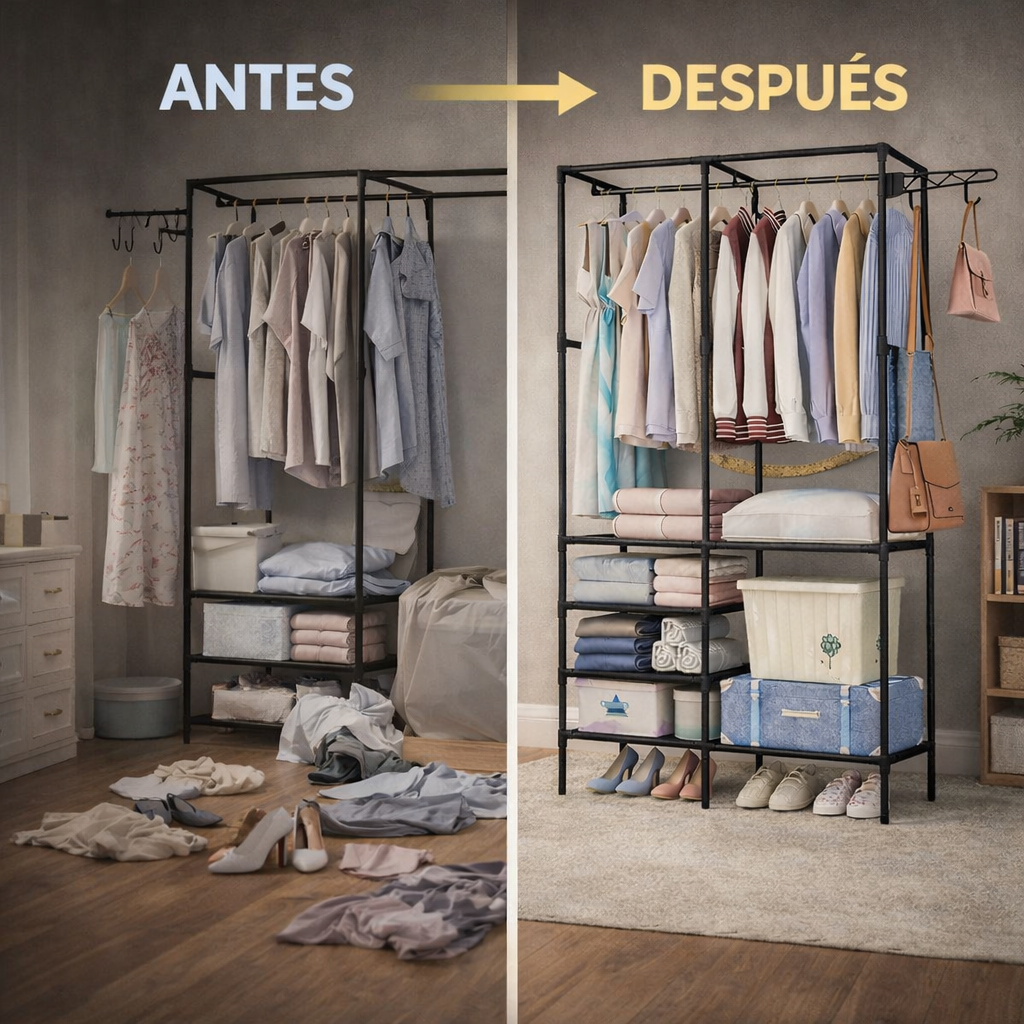 🟢 Después: El mismo espacio se transforma por completo con el uso del closet organizador multifuncional. La ropa está colgada de manera ordenada, los estantes inferiores contienen ropa doblada, cajas y organizadores, y los zapatos están alineados en la parte baja. Los bolsos cuelgan en los ganchos laterales. El ambiente luce más amplio, limpio y armonioso, con mejor aprovechamiento del espacio vertical y una iluminación más clara que transmite orden y tranquilidad.