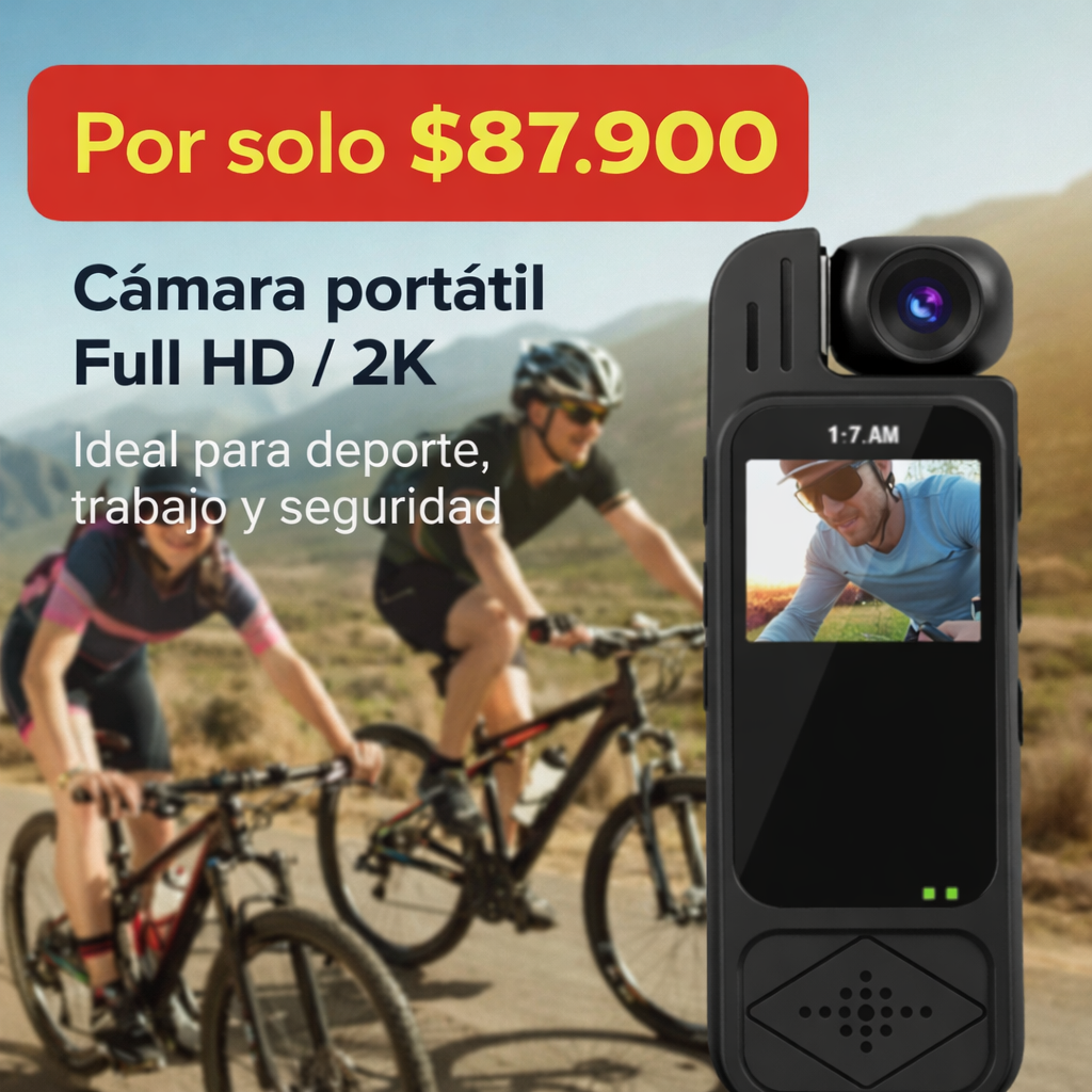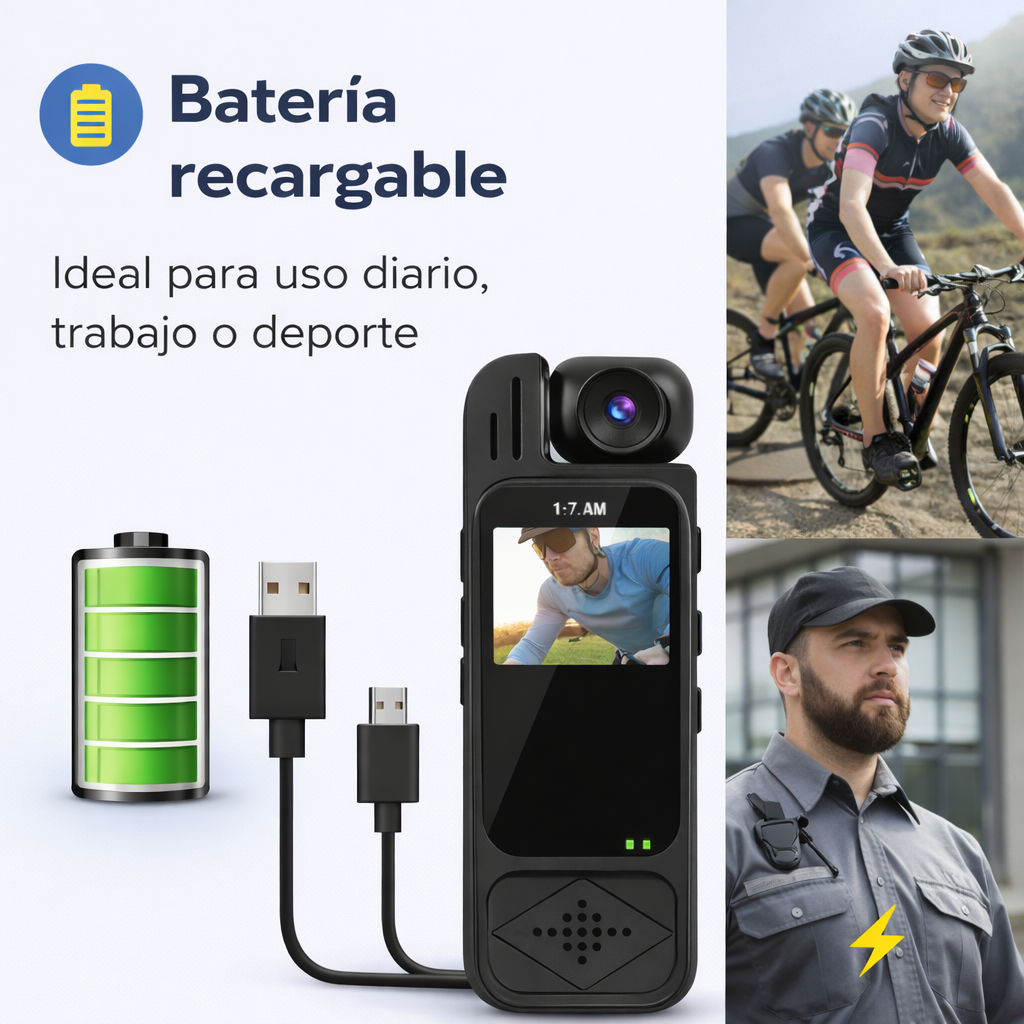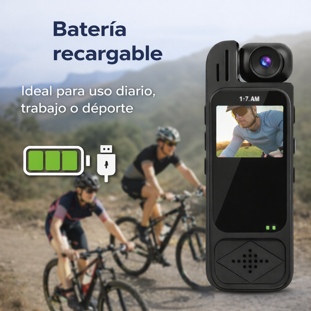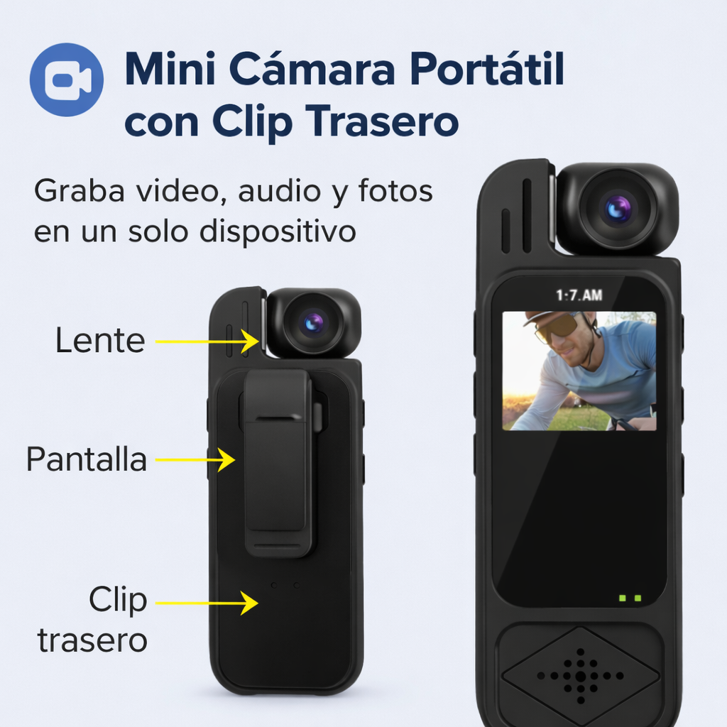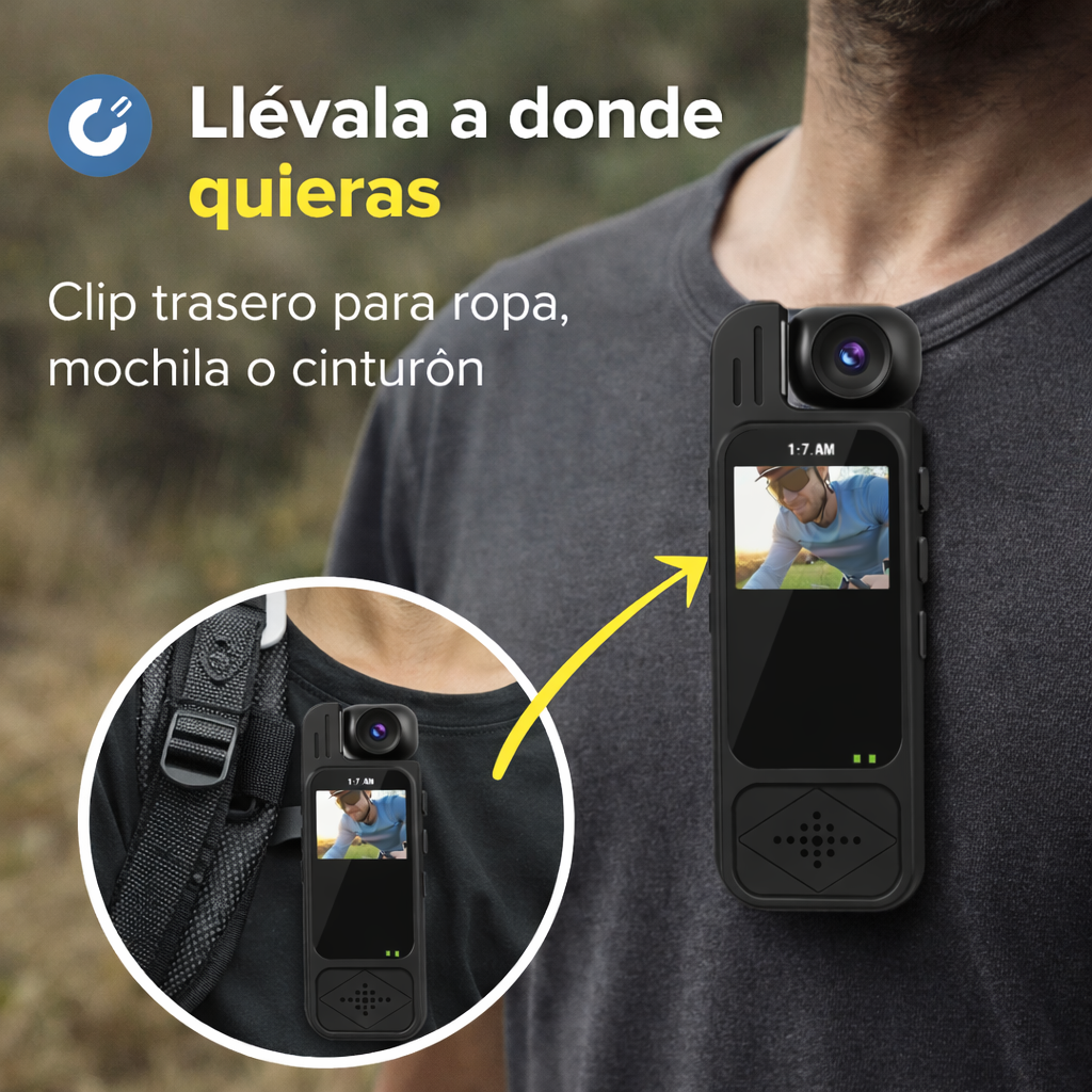 Su diseño portátil permite grabar sin ocupar las manos, de forma cómoda y discreta.